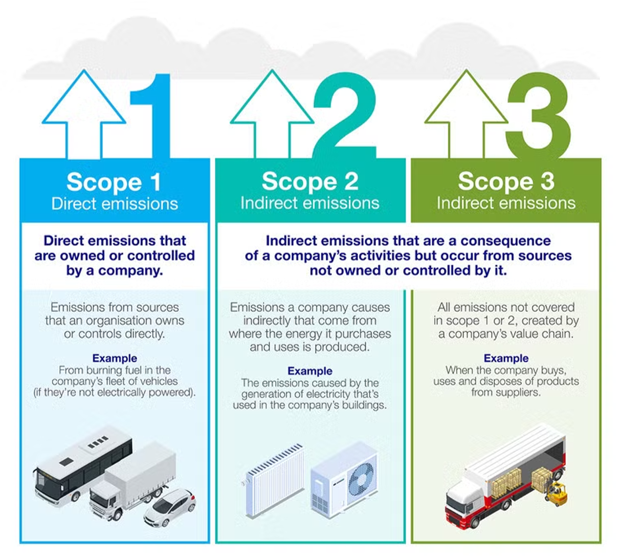 Emise CO₂ se dělí do tří hlavních kategorií podle tzv. Scope 1, 2 a 3: